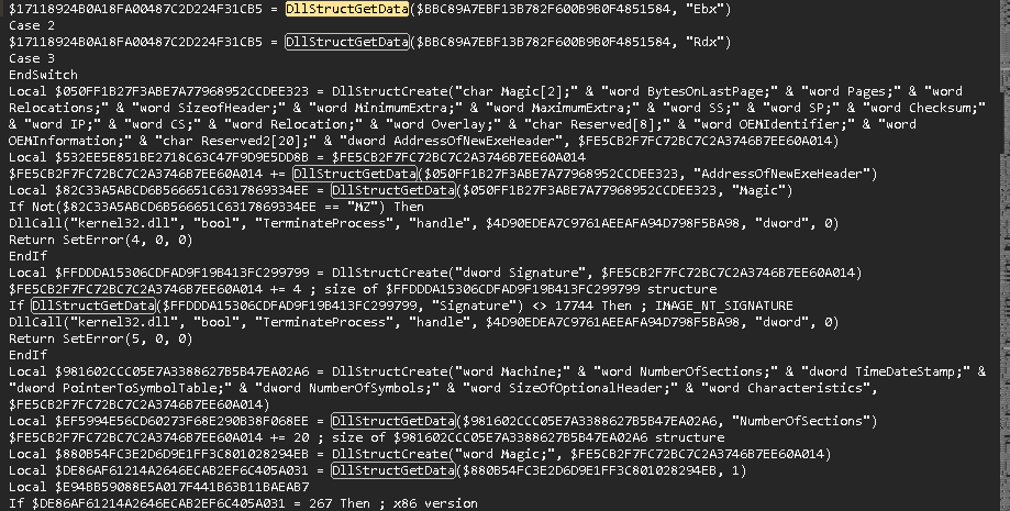 在创建并挂起RegSvcs.exe后,脚本会利用DllStructCreate等API完成进程映像替换。替换后RegSvcs.exe也就变成了一个脚本解释器。