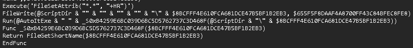 脚本会设置目录文件为隐藏和只读属性,然后会去读取svo.jpg中的二进制数据,解密出另一个脚本,并生成长度为五的随机大写字符串作为新的文件名。