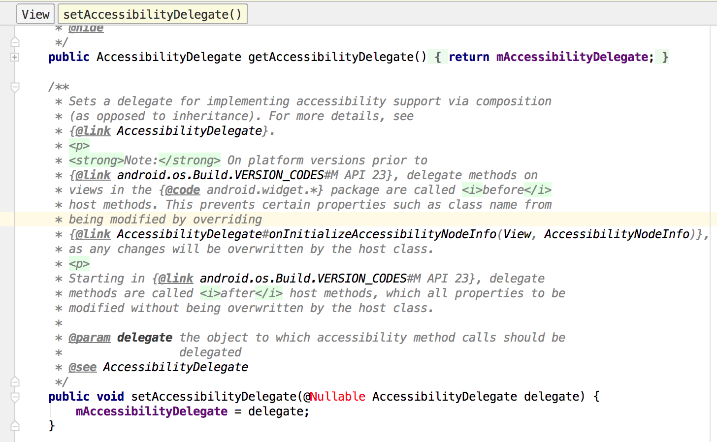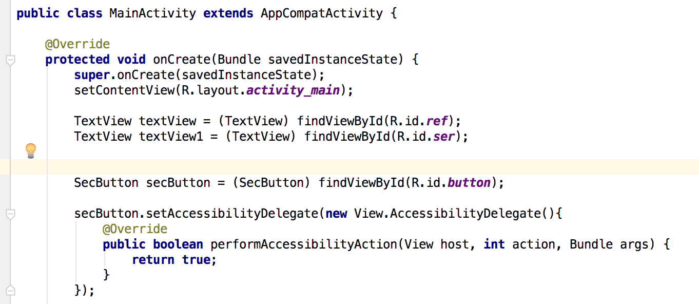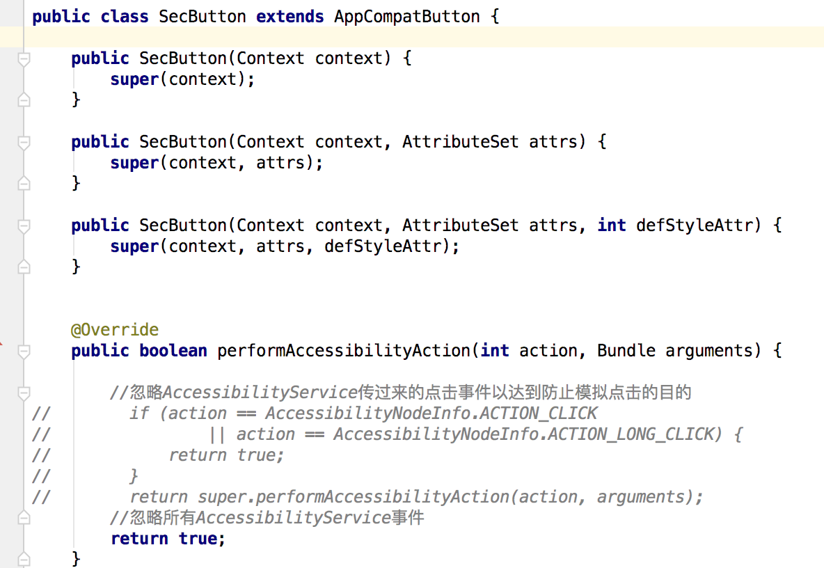 - 方案零:重写View类的performAccessibilityAction方法或者设置AccessibilityDelegate,过滤掉AccessibilityNodeInfo.ACTION_CLICK 和 AccessibilityNodeInfo.ACTION_LONG_CLICK等事件.如果不考虑视觉障碍用户可以过滤掉全部AccessibilityNodeInfo事件来完全禁止AccessibilityService对app内view的管控.