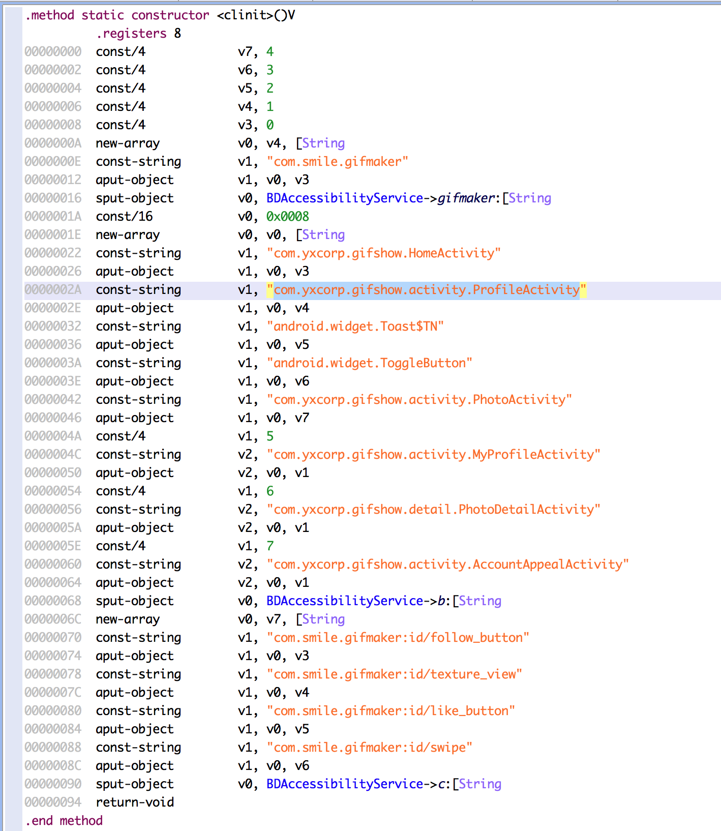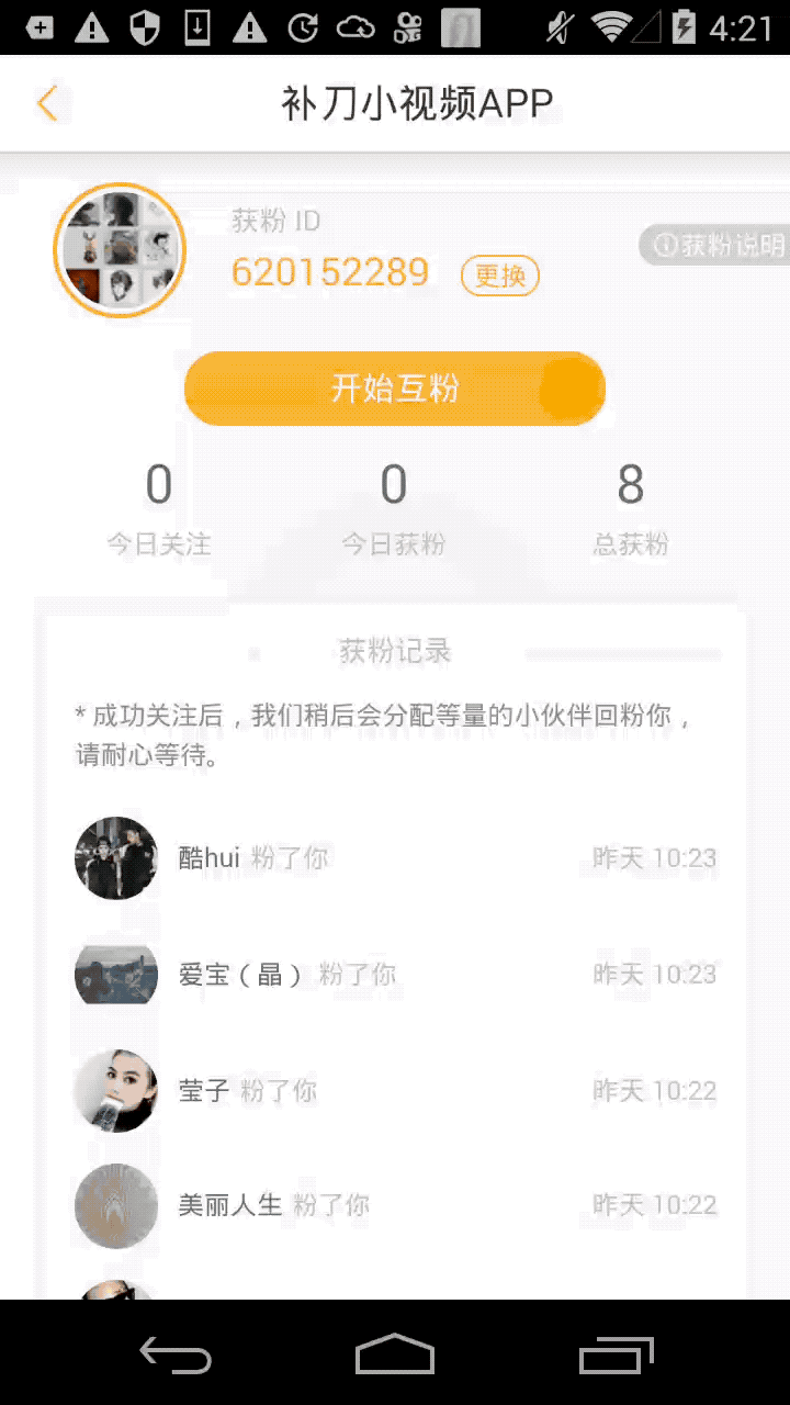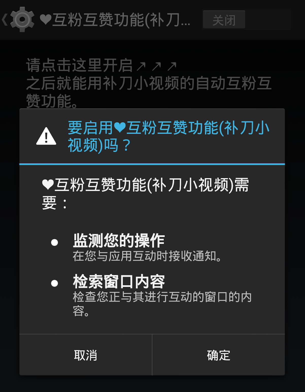 补刀小视频和快手互为竞品应用,目标群体类似.而快手用户量级明显多于补刀.快手很多用户有互粉需求,于是补刀小视频开发了快手互粉助手来吸引快手用户安装.互粉助手这个功能主要是利用Accessibility.