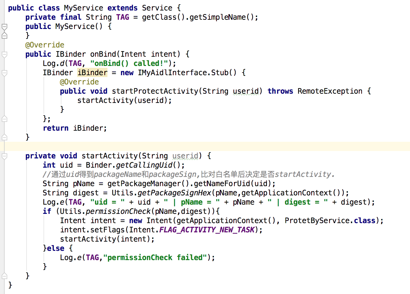- 方案二:Service中转,通过bindService的导出方法拿到调用方uid,再通过uid获取待验证的包名和签名.