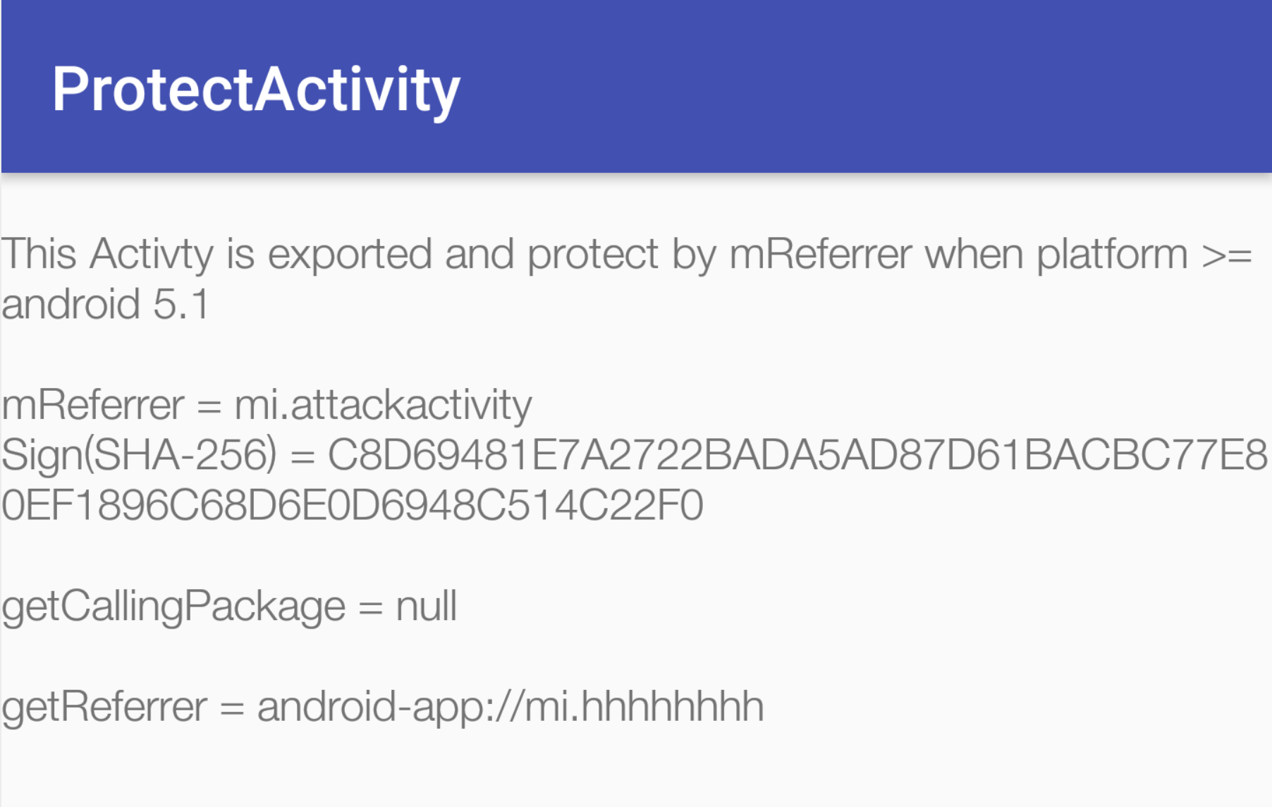 mReferrer赋值依赖调起方传入的参数,所以也是能伪造的,只是伪造相对前两种姿势要麻烦一点.通过反射或者 hook 操作自身进程内的 ContextWrapper / ContextImpl 关于packageName的Method和Field.