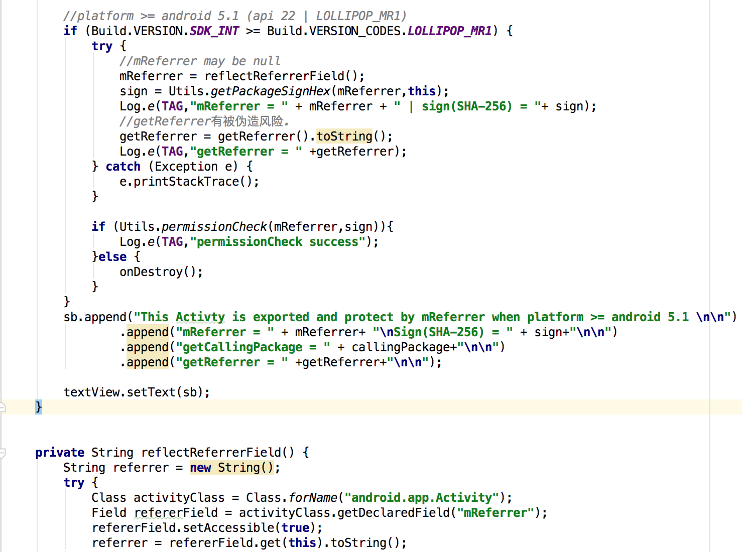 - 方案一:Referrer检测,通过反射拿到mReferrer即调用方包名再验证签名.