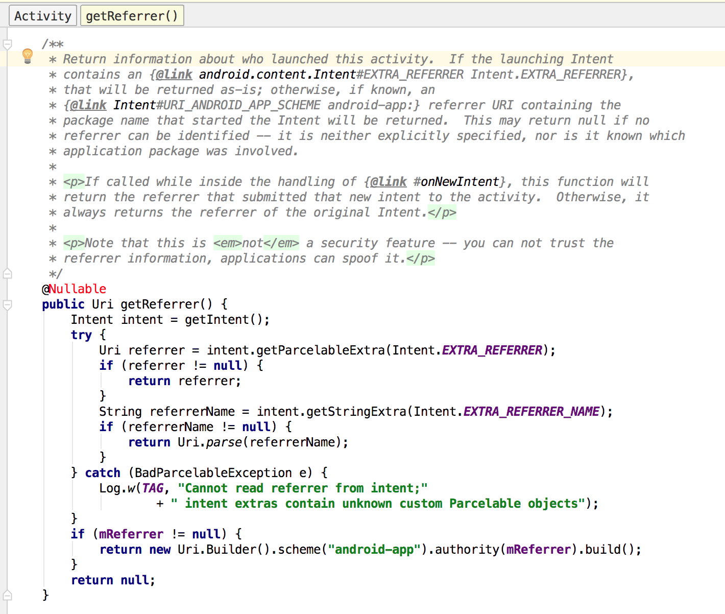 上图getReferrer()有三个return Referrer的调用,谷歌确把相对可靠一点的放在最后,应该是为了更高的可用性..