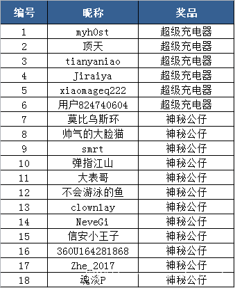 中奖名单已公布,请以下合规的获奖用户尽快将微信号、寄送地址和电话号码等联系方式统一(不要将信息分成多次分开发送~保证信息完整)发至安全客微信公众号,我们会核查你的中奖信息,并尽快安排礼物寄送哟~