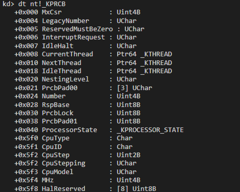 2、所有到nt!_EPROCESS、nt!_KTHREAD和nt!KPRCB结构的偏移量都是不同的。