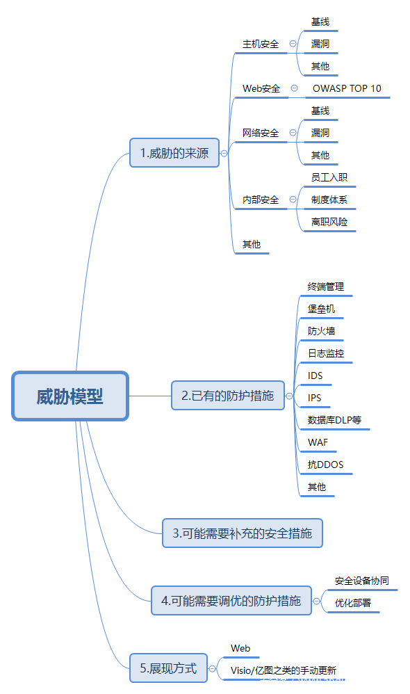 威胁建模,用于对外部威胁的汇总,这里前期考虑的是通用安全威胁,其实有点像风险建模,然后以图形的方式去汇总整个威胁图,这个拓扑图实际上就是按类威胁汇总,图形化显示,然后中间可以加上防护措施,和备注一下缺陷和可能存在的优化点