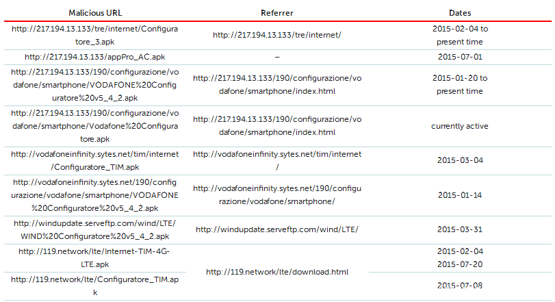 他们观测到许多模仿移动运营商登陆页面的网站,这些网页主要用于传播Android植入物。攻击者自2015年就已经注册了这些域名。根据遥测数据,这是传播最为活跃的一年。传播活动仍然在继续:最近观察到的域名于2017年10月31日登记。根据我们的KSN统计数据,受感染的用户主要位于意大利境内。