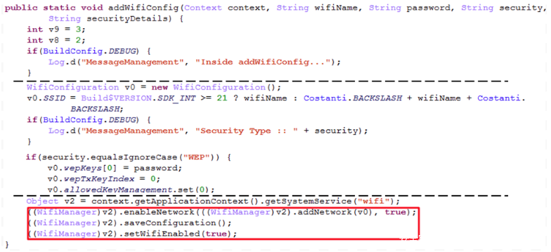 - Wifi:通过命令创建一个具有指定配置的新Wi-Fi连接,如果Wi-Fi被禁用,则启用Wi-Fi连接。所以,当设备连接到已建立的网络时,这个过程将是静默和自动的。该命令用于将受害者连接到由网络犯罪分子控制的Wi-Fi网络,以执行流量嗅探和中间人(MitM)攻击。