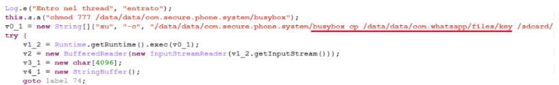 在接收到特定的命令后,恶意软件可以下载特殊的有效载荷以从外部应用获取敏感信息。我们观察到的情况涉及WhatsApp。