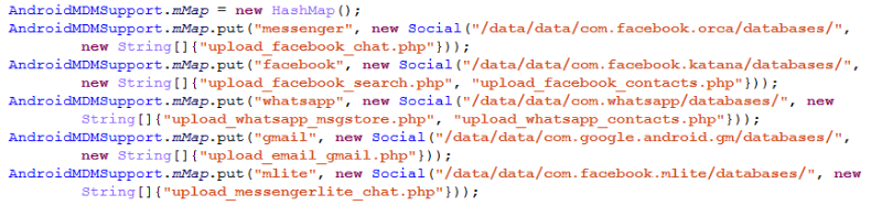 - Social:启动“AndroidMDMSupport”服务的命令 – 这允许抓取任何其他安装的应用程序的文件。服务名称清楚地表明,攻击者通过应用程序将MDM解决方案作为业务特定工具。控制者可以使用任何目标应用程序的数据库和服务器端PHP脚本名称来指定路径上传。