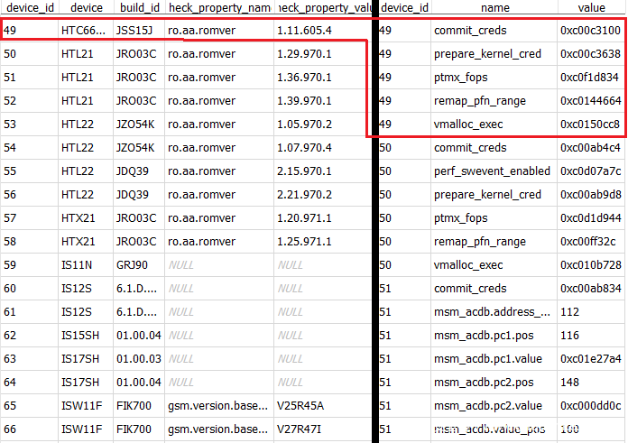 ‘device.db’是exploit使用的数据库。它包含两个表’supported_devices’和’device_address’。第一个表包含205个设备以及部分Linux属性的信息;;第二个包含与成功利用所需的特定内存地址相关联的地址。如果受感染设备未在此数据库中列出,则漏洞利用程序尝试发现这些地址。