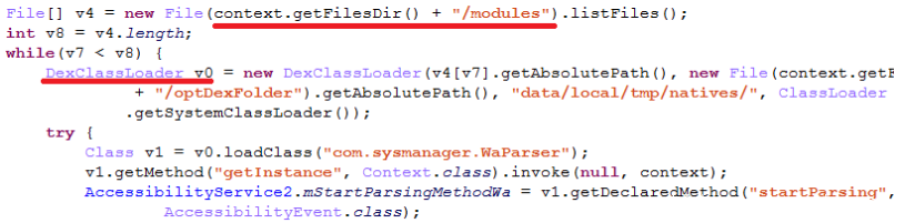 负载可以是一个.dex或.apk文件,这是一个Java编译的Android可执行文件。下载之后,它将通过DexClassLoader api由主模块加载: