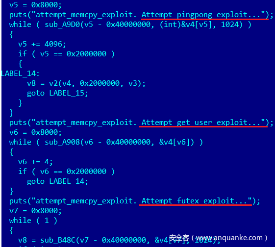 下载和解包后,主模块执行漏洞利用二进制文件。一旦执行,模块将尝试通过利用以下漏洞获得设备的root权限: