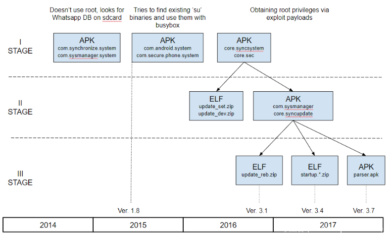 第一阶段:该阶段是进化的初始阶段,开始于2014年,此阶段初期的恶意软件并没有使用root,窃取社交软件数据库等功能。后期增加了使用root权限的功能。