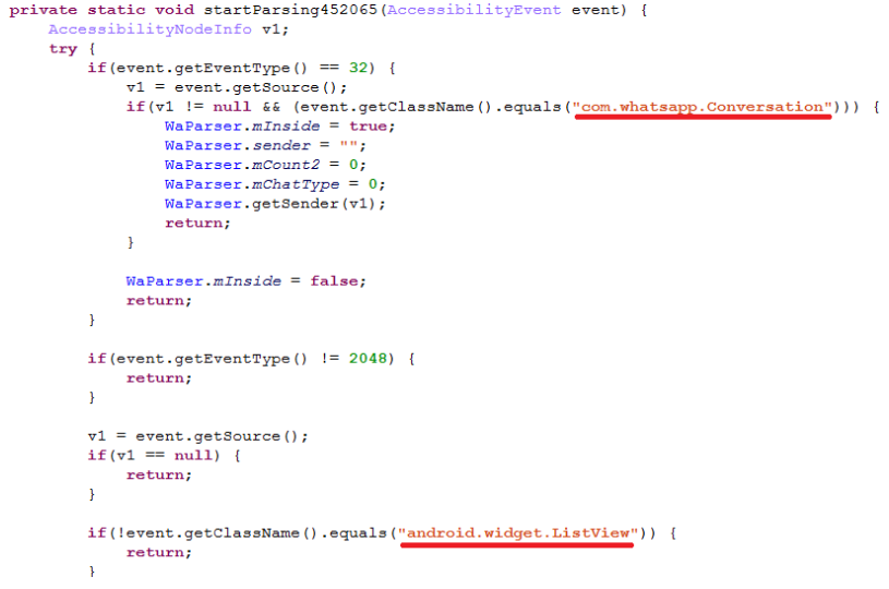 我们观察到专门针对WhatsApp Messenger的有效载荷。有效载荷使用Android Accessibility Service从屏幕上显示的元素直接获取信息,因此它等待目标应用程序启动,然后解析所有节点以查找文本消息: