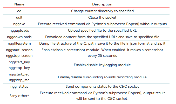 远控方式更加多样化:攻击者具备通过HTTP,XMPP(基于XML的协议),二进制SMS和FirebaseCloudMessaging(流行的推送服务)(或旧版本的GoogleCloudMessaging)协议来远程控制受控端的能力。这种协议的多样性给攻击者更加灵活的控制。在最新的版本中有48个不同的命令。下面是一些最值得注意的命令: