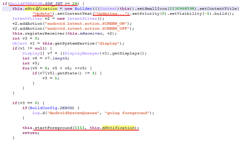 几乎所有的服务都实现了自我保护功能。由于在Android 8.0(SDK API 26)系统能够杀死空闲的服务,这段代码生成了一个假的更新通知,以防被杀死:
