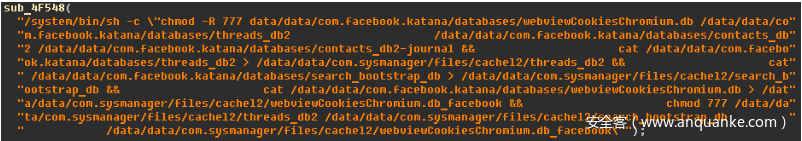 实际上,这不是一个独立的有效载荷文件。在所有观察到的版本中,它的代码是在一个文件(’poc_perm’,’arrs_put_user’,’arrs_put_user.o’)中利用有效载荷进行编译的。这是由于在执行社交载荷操作之前,恶意软件需要提升权限。该有效载荷也被早期版本使用。它具有与当前版本中的“AndroidMDMSupport”命令类似的功能(窃取属于其他已安装应用程序的数据)。有效载荷将执行shell代码来窃取来自各种应用程序的数据。下面的例子窃取Facebook数据: