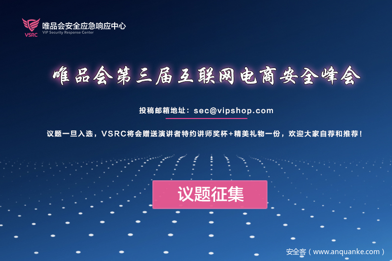 随着电商行业的高速发展,业务成长尤其迅猛,围绕着业务保障的安全工作也愈发紧迫和重要,成为企业保证竞争力的成败要素之一。电商行业面临的安全挑战也同样日益突出、安全形势愈发严峻。在此背景下,为了深度探索互联网电商信息安全之道,由国内第三大B2C电商——唯品会主办,国内电商与信息安全的盛会——2018唯品会第三届互联网电商安全峰会,即将来袭!即日起,开始征集议题,诚邀有内涵的你,分享有料的议题!