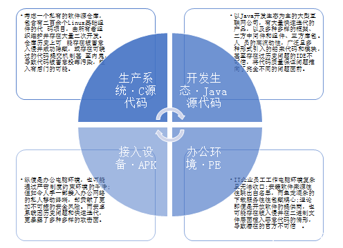 以Java开发生态为主的大型互联网公司,特点有大量快速迭代的产品,以及多种多样的框架、二方中间件和组件、三方库包。人员的高流动性,广泛且多种形式引入的舶来代码和模块,甚至存在过历史问题的IDE不可信,将代码质量保证问题推向了完全不同于开源软件代码赛季、Windows客户端软件赛季的全新范畴和高度:仓库规模不是唯一问题,保证跟进源码迭代速度的安全扫描能力、全生态链路保障,才是考验。