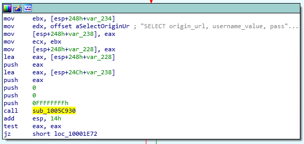 Olympic Destroyer会释放出一个浏览器凭据窃取器(Browser Stealer)。最终的攻击载荷嵌入在经过混淆处理的资源中,恶意软件样本必须使用前面提到的2个参数才能正确执行攻击载荷。这款窃取器支持IE、Firefox以及Chrome浏览器。恶意软件会解析注册表,查询sqlite文件,获取所需的浏览器凭据信息。样本中集成了SQLite功能,如下所示: