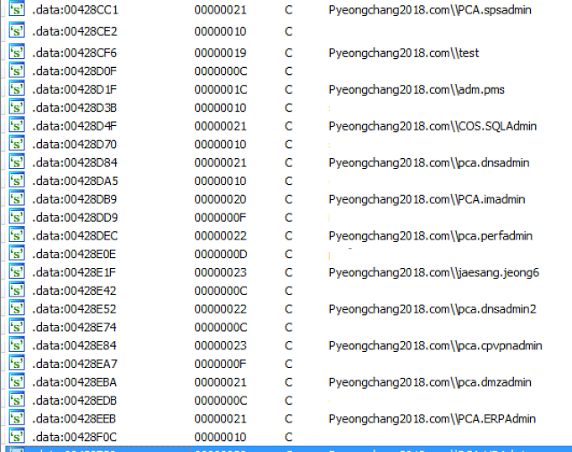 如你所见,恶意软件所使用的域名与Pyeonchang 2018(平昌2018)有关。这款恶意软件的作者对奥运会的基础设施细节了如指掌,比如用户名、域名、服务器名以及密码。我们在二进制文件中总共识别出了44个不同的账户信息。