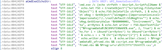 恶意软件使用PsExec以及WMI(通过Win32_Process类)在网络中扩散。远程执行的代码如下所示: