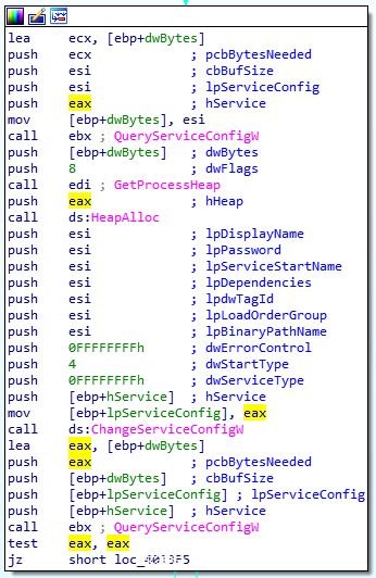 恶意软件使用ChangeServiceConfigW这个API,将服务的启动类型改成4,意思是“已禁用:不启动指定服务”。