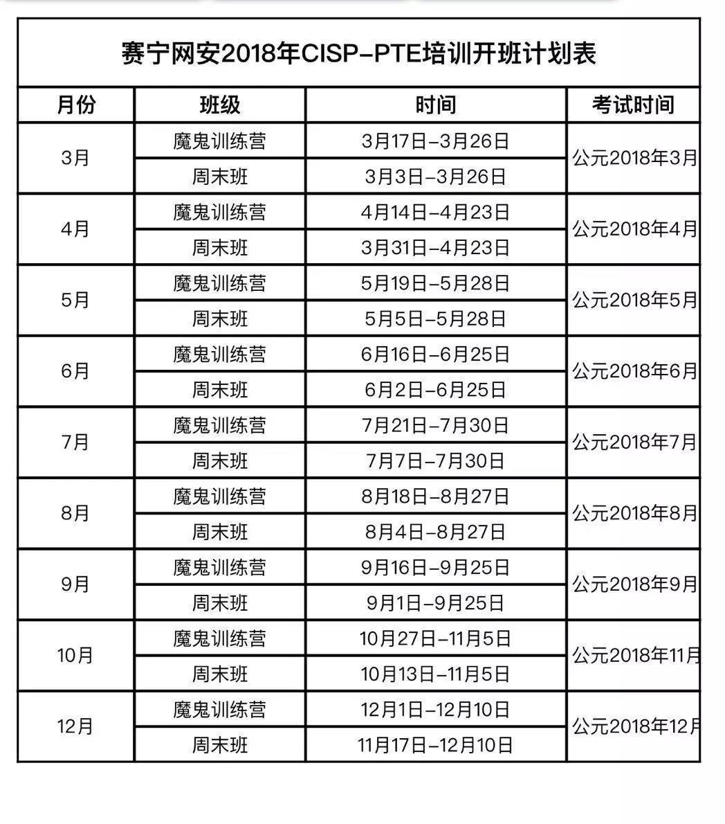 由CISP-PTE认证考试中心360企业安全与CISP-PTE认证考试授权培训机构赛宁网安携手打造史上最专业、最高效的考前魔鬼训练营,目前已经连续开办了四期,每一期的课程和模拟测试都是干货满满,让学员大呼过瘾超值。年前,赛宁网安2018年的培训排期出炉,各位想要学习的工程师安排好自己的时间哦!3月份的班次周末班将于3月3日开课,魔鬼训练营集中班将于3月17日开课!
